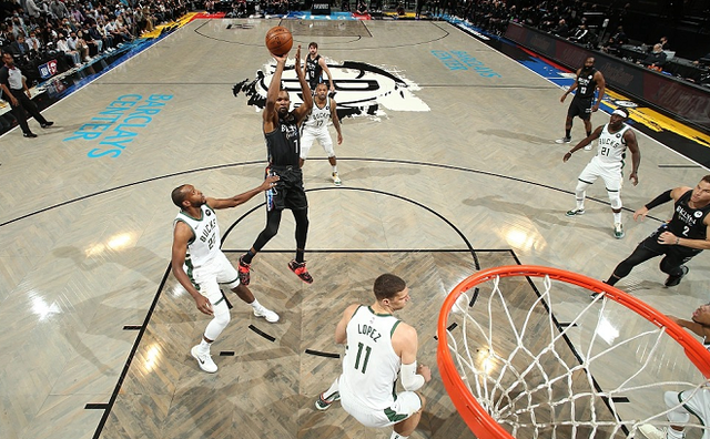 第二节开始后,篮网的进攻状态逐渐回暖,雄鹿也延续了第一节的手感,两边展开了对攻大战,但雄鹿始终将优势维持在10分以上。中段杜兰特凭借一记跳投将分差缩小到个位数,眼看着篮网要起势了,但字母哥突然爆发,先是在外线顶着防守人强投一个三分,随后又面对格里芬的防守投中一个中距离,最后又在攻防转换中一步过掉哈登,突破暴扣连砍7分又一次拉开分差。