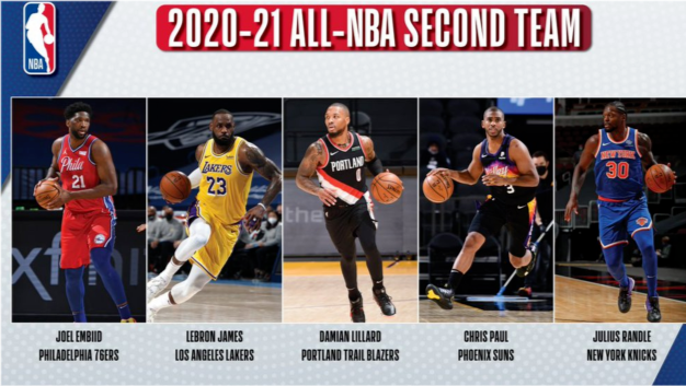 而最佳第二阵容方面,詹姆斯、恩比德、利拉德、保罗和兰德尔,在这五位球员当中,詹姆斯和恩比德在保持健康的时候,他们均打出了MVP级别的表现,在MVP评选当中,长期排在前三位,不过因为后续伤病影响,导致他们出场次数下滑,在这次评选当中,他们只能够入选第二阵容,而利拉德、保罗和兰德尔,他们本赛季在个人表现和带队方面都有着不错的发挥,利拉德带领着开拓者队进入到了季后赛,而保罗的太阳队排在西部第二位,兰德尔带领着尼克斯队时隔多年后再次进入季后赛,他们入选也在大家的预料当中。