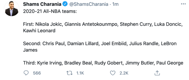 在这份名单当中,大多数本赛季常规赛表现出色的球员都出现在了这份榜单中,不过也有少部分在常规赛表现出色,但最终落选的,比如太阳队的布克,奇才队的威少,爵士队米切尔,凯尔特人队的塔图姆,灰熊队的莫兰特,老鹰队的特雷杨和篮网队双星杜兰特,哈登等,他们球队战绩和个人数据都很不错,只不过很遗憾的是,在这份榜单中,他们最终落选,无缘入选本赛季最佳阵容。