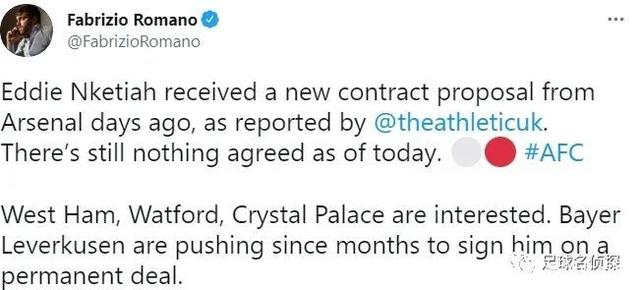罗马诺发推:正如The Athletic报道的,恩凯蒂亚几天前收到了来自阿森纳的续约合同,不过截止目前任何事情都还没达成协议。西汉姆、沃特福德、水晶宫都对恩凯蒂亚感兴趣,勒沃库森则是几个月前就在推动签下(直接购买)这名前锋。