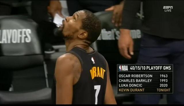 这样一来,杜兰特成为NBA季后赛历史第4位单场比赛得到至少40分15板10助的球员,另外3名球员分别是东契奇(2020),查尔斯-巴克利(1993)和奥斯卡-罗伯特森(1963)。