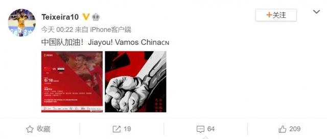 直播吧6月16日讯 在中国队对阵叙利亚的赛前,江苏队旧将特谢拉发布个人微博为中国队加油。