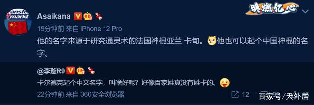 媒体人李璇暗示,卡尔德克有望归化,“卡尔德克起个中文名字,叫啥好呢?好像百家姓真没有姓卡的。”德转朱艺回应道:“他的名字来源于研究通灵术的法国神棍亚兰-卡甸。他也可以起个中国神棍的名字。”