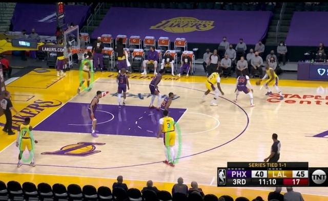 看完这两个回合,我们就会发现有戴维斯吸引防守注意力和挡拆时,詹姆斯打得很轻松自如的。而在戴维斯受伤之后,湖人没有好的挡拆手,加索尔、德拉蒙德移动速率太慢、没有进攻威胁,所以此时詹姆斯再来打挡拆就是主动要求太阳队上包夹和协防(下图为例),而著名的骑士“季后赛詹”当时身边就有速度更快的汤普森和投射速率、准度更好的弗莱