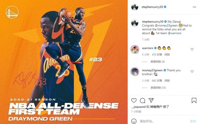 库里写道:“我的狗!恭喜你!忍不住提醒一下人们你是谁一阵!”追梦也在评论区回复了库里致谢。