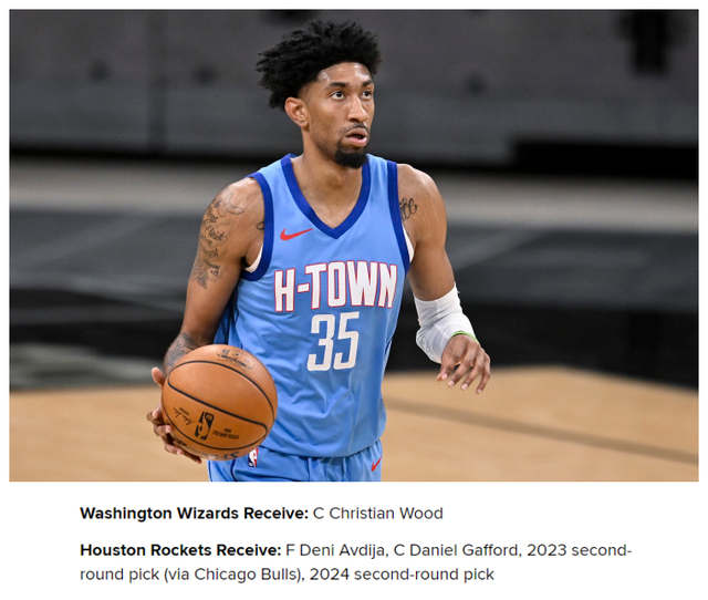 具体的交易方案是火箭送出伍德、从奇才得到阿夫迪亚、加福德、2023年来自于公牛的二轮签、2024年二轮签。