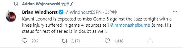 根据快船记者Farbod Esnaashari则表示,伦纳德就是遭遇了十字韧带伤势,他昨天已经告诉了队友这一消息。伦纳德很可能缺席这轮系列赛剩余所有比赛。