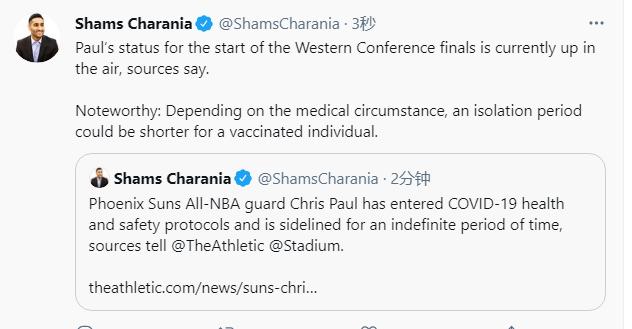 先说太阳:根据美国名记Shams报道,刚刚4:0横扫掘金晋级西决的太阳队,突然传来了坏消息,球队当家控卫,太阳队绝对的组织核心克里斯保罗,因触发新冠安全协议,将遭遇无限期缺阵。相信这一消息对于刚刚晋级的太阳队来说,晋级西决的屁股还没坐热了,就遇到个这情况。对太阳来说太难接受了。