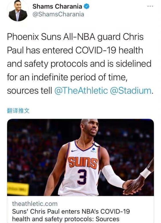 然而,噩耗却在此时来临。据The Athletic记者Shams Charania报道,太阳后卫克里斯-保罗触发联盟健康与安全协议,将无限期缺阵。