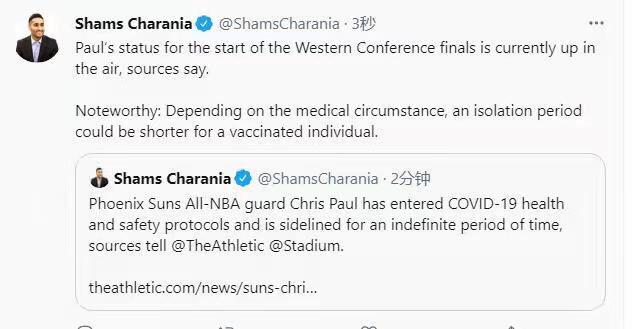 据名记Shams爆料,太阳球星克里斯-保罗由于触犯了联盟的防疫规定而遭到联盟无限期禁赛。目前保罗正在接受隔离,而具体的原因联盟和太阳队官方并未透露。个人认为保罗可能是在太阳队横扫掘金后的这段时间接触过新冠感染者,并且有已经被传染的可能性。他的复出时间官方也并未给出明确的答复,圣保罗能否出战西决比赛成了疑问。
