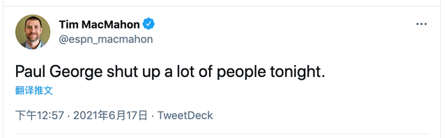 正如美媒蒂姆-麦克马洪在社交媒体上所谈及的那样,乔治在这场比赛中的表现足以让很多人闭嘴: