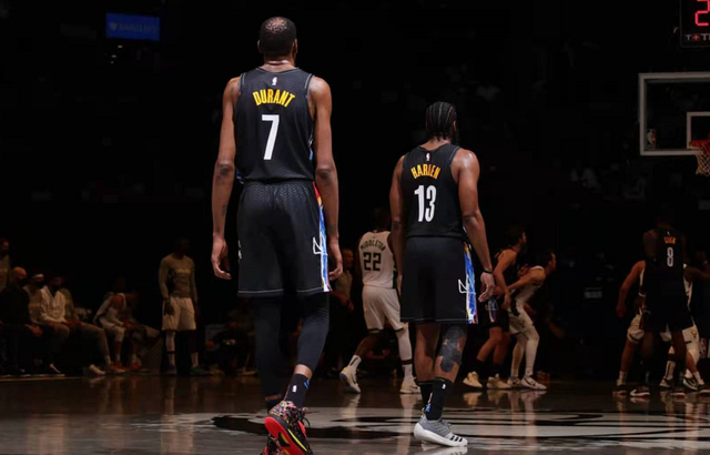 篮网球权,哈登降慢节奏,进攻时间最后3秒,遭遇包夹,传给三分线外的杜兰特,后者果断出手,三分远投,球进灯亮。