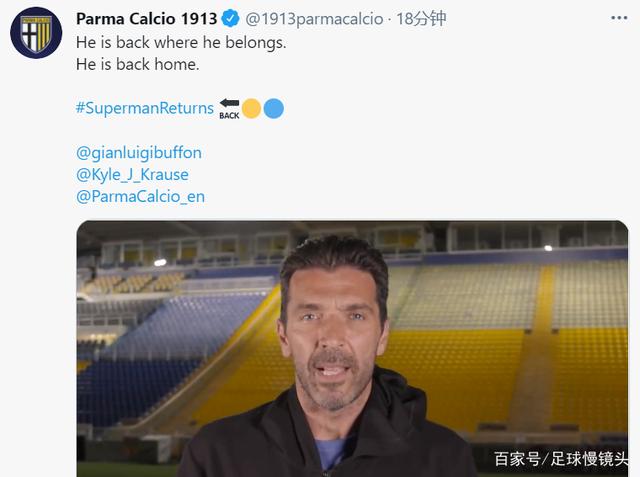 在推特上,帕尔马俱乐部发布了一段视频,配文是,“他回到了属于自己的地方,他回家了。”视频内容也非常有趣,布冯拿着铁锹,挖出一个在球场内埋下的木质盒子,打开后,里面是帕尔马的球衣,同时还有一件超人的衣服,帕尔马非常用心的是,盒子里还有布冯效力帕尔马期间的照片。在视频的最后,布冯说道,“我回来了!”