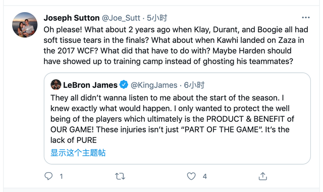 “拜托!那两年前汤普森、杜兰特和考辛斯在总决赛也遭遇软组织撕裂,伦纳德在2017年遇到被扎扎垫脚受伤,这又是什么情况?和联盟赛程有什么关系?也许哈登真应该出现在训练营而不是到处去浪!”