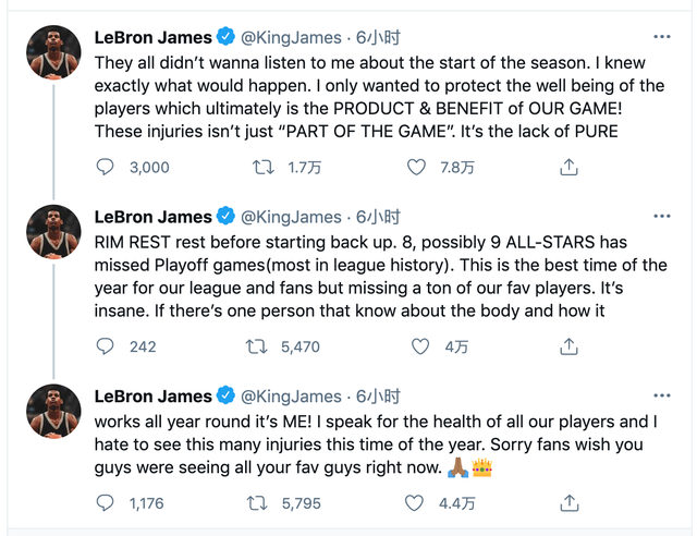 “他们都不想在赛季开始的事情上听我说的话”詹姆斯写道,“我确切知道会发生什么,我只是想要保护球员们的福祉,这最终会对提升我们的比赛质量!这些伤病不仅仅是比赛的一部分。”