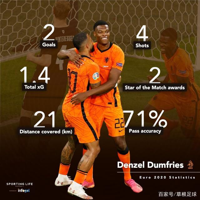本届欧洲杯,邓弗里斯是截至目前唯一一名连续2场比赛进球并且都当选MVP的球员,值得一提的是,这只是邓弗里斯职业生涯第1和第2场欧洲杯正赛,邓弗里斯身上的大赛属性爆表——要知道本赛季他在埃因霍温踢了30场荷甲,一共才打进2球。