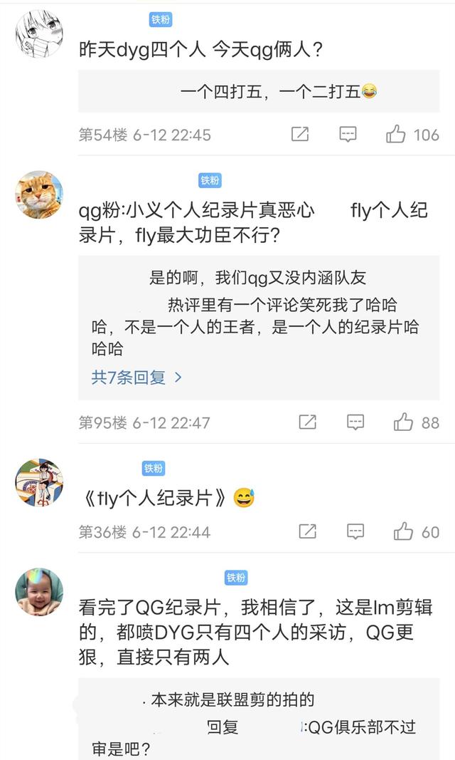 而这次重庆QG纪录片受到不满的原因,和深圳DYG一样,都是因为纪录片的人数,不过深圳DYG的纪录片有四个人,重庆QG的纪录片却只有两个人,并且几分钟的纪录片中,飞牛还占了其中大部分的镜头。在看到重庆QG的纪录片之后,许多粉丝都纷纷吐槽,深圳DYG在四打五,重庆QG这算什么,二打五吗?