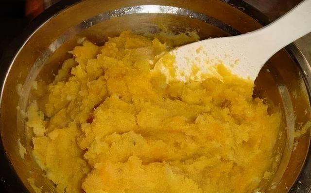 然后把鸡蛋打开,搅拌均匀,然后将烤好的红薯放在盘子里捣碎,再将搅拌好的鸡蛋液、玉米粉、奶粉、蚕豆粉倒入,充分搅拌。