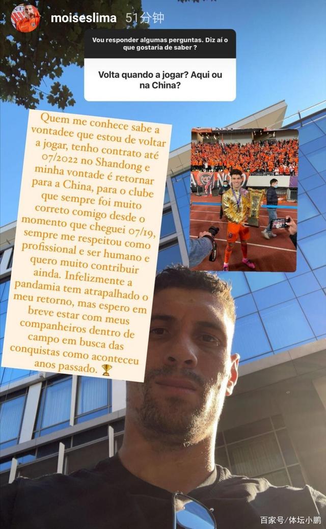 莫伊塞斯近期在社交软件与球迷互动,并大方回答球迷朋友的问题。有球迷问莫队的职业生涯目标是什么?莫伊塞斯回答到:“无论在哪,都希望可以保持胜利,并且有一个积极的态度。”当然大家所关心的还是莫伊塞斯何时能够回归的问题。莫伊塞斯回答说:“任何人都知道我特别想要回到球场,我与泰山队合同到2022年7月才结束,我特别想要回归,但是由于疫情的影响导致迟迟无法及时回来。如今事态已经向好的方向发展,我很快就将回归母队山东泰山。”我们了解到,目前泰山队已经为莫伊塞斯办理完入境手续,他也将会在20日前后从贝尔格莱德直飞上海。