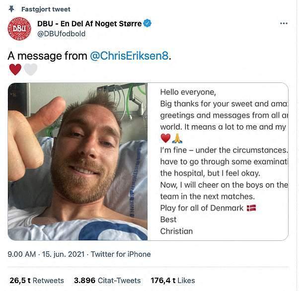 北京时间6月18日凌晨,丹麦队将在小组第二战中迎战世界排名第一比利时队,赛前,无论是外界还是两支球队的队员,都认为这将是一场为埃里克森而战的比赛。丹麦主帅尤尔曼在赛前的新闻发布会上表示,还在医院接受治疗的埃里克森会通过电视直播观看丹麦同比利时的这场比赛。据悉,埃里克森所在的医院距离球场很近,“当他从窗户看出来他就会看到球场,而且也很可能会听到所有比赛的声音。”