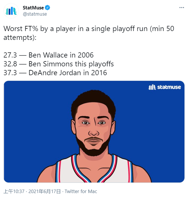 这样一来,本西蒙斯季后赛至今,罚球攻击67罚22中,命中率仅为可怜的32.8%。