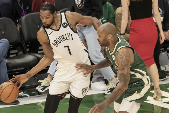 次节比赛归来,米德尔顿终于开始发力,一个中投一个3+1,连得6分再次拉开分差,但是哈登也切换了进攻模式,三分和抛投样样都有,杜兰特也安心的下场休息,这是天王山之战至今,杜兰特第一次下场休息。篮网一度将分差缩小到4分,但是字母哥篮下打进,米德尔顿三分也有,杜兰特重新回到场上,回来之后立马三分轰进,分差再次回到5分。