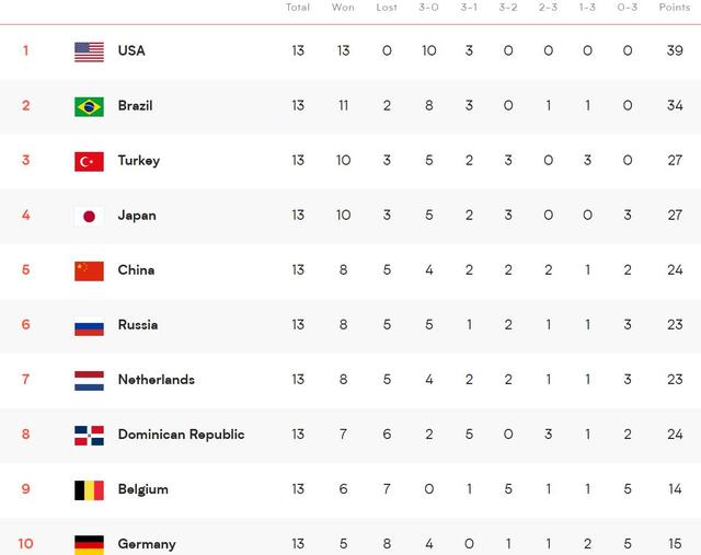 土耳其3-0横扫荷兰之后,总战绩改写为10胜3负,领先中国女排两个胜场,出线前景一片光明。最后两轮,土耳其的对手分别是韩国与巴西,虽然巴西的实力比较强,但是对阵排名倒数第二的韩国,土耳其只要取胜,就能提前晋级。韩国在李在英和李多英等主力离队之后,实力下滑十分明显,前13轮仅3胜10负,整体实力很难与全主力出战的土耳其抗衡。所以,土耳其晋级的希望非常大。