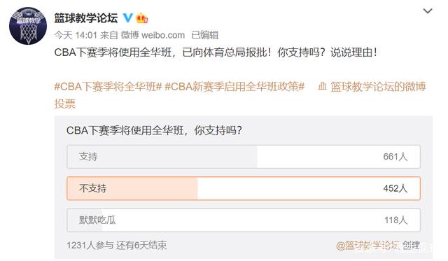 新规一出,自然有不同的声音。教主发起了一个投票,有人支持也有人反对。有些球迷认为:全华班对本土年轻球员来说是好事,他们能有更多的上场机会,也有利于中国篮球的发展。另一部分认为:这是在闭门造车,联赛观赏性会大大降低,可能是CBA史上最无趣的一个赛季。
