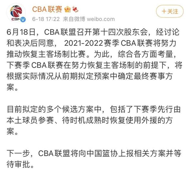 CBA官方也对此事进行回应:2021-22赛季CBA联赛将努力推动恢复主客场制比赛(这个是大前提)。综合多方面考量,目前拟定了多个候选方案,其中包括下赛季先行由本土球员参赛(全华班)、待时机成熟时恢复使用外援的方案。