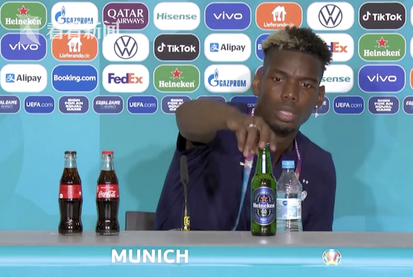“德法大战”赛后,法国球星博格巴被评为全场最佳球员,需要在采访室接受提问。美联社报道称,作为穆斯林的他,并不喝酒,于是他便将摆在面前的一瓶喜力啤酒移出了镜头外。