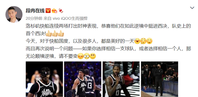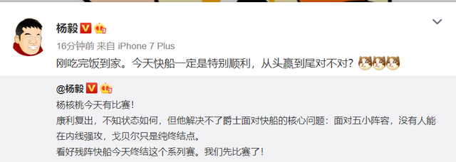 本场对决,莱昂纳德继续缺席,本赛季的季后赛,他可能都很难复出。很多人看好爵士,但是快船在主场依然有希望。赛前,杨毅预测快船会拿下系列赛,但当快船半场落后22分的时候,相信很多人都觉得,要被打脸了。但是,快船在第三节绝地反击,单节赢了19分,他们在第四节完成了逆转,拿下了这个系列赛,赛后杨毅也是笑言:“今天快船一定是特别顺利,从头赢到尾对不对?”然后,加了三个表情。