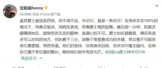 爵士的赛季结束了,但是米切尔的发挥还是让人佩服,他带伤拼到了最后,沈知渝也夸赞了米切尔,但爵士自己的问题,也是需要好好总结,他们其实阵容配置不差,但太依赖三分球,这也是未来需要改变的地方。而快船创造了历史,卢指导新的突破,乔治的正名,这都是让快船球迷幸福的一天。