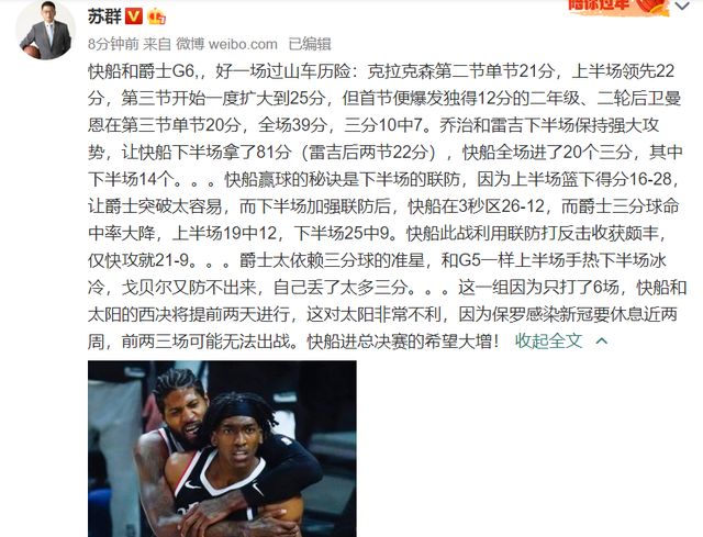 很显然,这场比赛快船打得非常不顺,他们一度陷入绝境,但是他们完成了逆转,苏群也指出快船逆转的关键,那就是防守的改变,他们下半场用了联防,限制了爵士的内线进攻,同时爵士太依赖三分,这也是他们输球的原因,第五场和第六场,都是输在了三分。苏群也分析西决的对决,保罗缺席两三场的情况下,快船的希望大增。