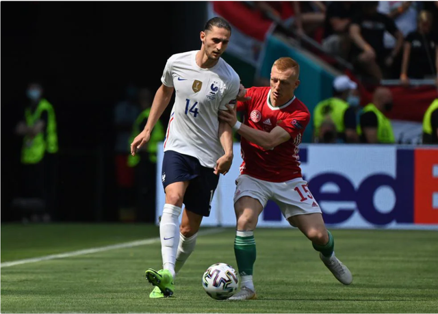 法国的攻势非常凶猛,本泽马、姆巴佩都曾浪费绝佳机会,法国队场面上占据优势,却无法打破僵局。上半场补时进行到第2分钟,匈牙利意外打破僵局,帕瓦尔停球失误,菲欧拉突入禁区爆射近角得手,半场匈牙利1-0领先,这个丢球让场边的德尚也非常着急。主场的匈牙利球迷则陷入沸腾。