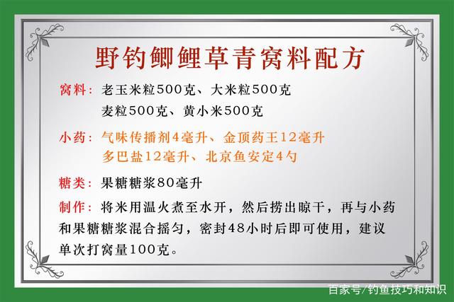 纯野钓技巧和经验的干货分享最后,根据目标鱼来调配窝料。野钓是,窝料是非常重要的,因为野钓的核心是诱鱼,自然水域的水质很好,窝料气味在水中的传播范围较大,只有调配得当,能够把鱼诱到窝里,就能钓得不错。鲫鱼、鲤鱼、青鱼、草鱼和鳊鱼这几种淡水鱼类的食性相近,都喜欢吃五谷杂粮,使用玉米、麦子、大米和黄小米来制作野钓窝料,既能够满足大鱼的需求,还能够吸引鲫鱼等小型鱼类进窝,各位钓友可以参考下图的野钓窝料配方,很多钓友反馈,该配方野钓的诱鱼效果非常好,值得长期使用。