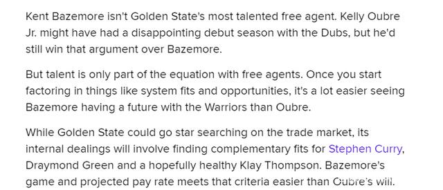 而且有流言表明凯利-乌布雷有意争取一份年薪在2000万美金左右的长合同,且不说他最后能不能拿到,他已经有了这样的想法,那么薪资空间无比紧张的勇士肯定是留不住他了。相反续约贝兹莫尔应该不需要付出太大代价,球队主教练史蒂夫-科尔也非常喜欢他,在本赛季后半段贝兹莫尔就长期出任先发,看上去双方在休赛期继续合作的可能性还是蛮大的。