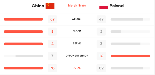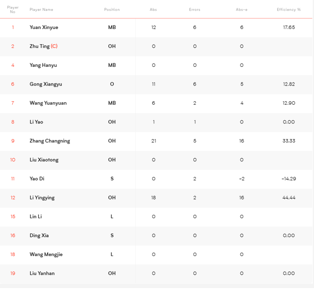 本场中国队有六人得分,4人得分上双,其中张常宁全场得分最高。本场张常宁24扣18中,扣球得分效率很高,外加3次拦网,共得到21分。李盈莹23扣17中,扣球得分效率同样很高,外加1次直接发球得分,共得到18分。袁心玥11扣8中,外加2拦2发,共得到12分;龚翔宇19扣10中,外加1次拦网,共得到11分。王媛媛6扣3中,外加2拦1发,共得到6分。栗垚出场时间不多,扣球得到1分。