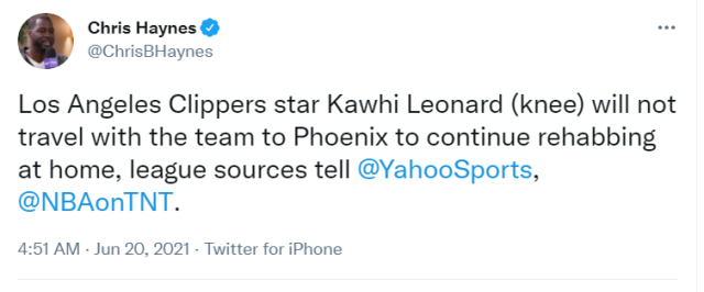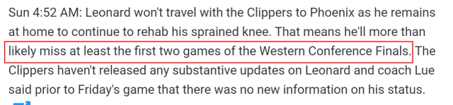 北京时间6月20日,据名记克里斯-海耶斯报道,快船球星科怀-莱昂纳德因膝伤将不会随队前往菲尼克斯,他将继续留在洛杉矶进行康复。美媒跟进报道称,这意味着他大概率至少缺席西部决赛的前两场比赛。