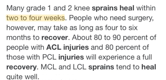 这样的伤势大概需要多长的恢复时间呢?美媒引用了一份膝伤研究报告,大部分1级和2级的扭伤,需要2-4周的恢复时间。如果需要手术,那么大概需要4-6个月的康复周期。报告还指出,80%-90%的前十字韧带扭伤,是可以百分百康复的。这意味着如果小卡是最轻级别的扭伤,最快可能也需要两周才能复出。