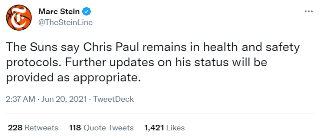 他们的西决对手是太阳,两队的首场比赛将在北京时间6月21日凌晨3点30分开打。太阳的核心保罗确诊新冠阳性,仍在隔离中,目前还不知道何时能够回归。