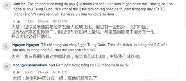 (上图)有球迷认为足球发展和经济发展成正比,但这点中国队是例外,因此他希望越南队能跟中国队分在一组,并以大比分碾压获胜。