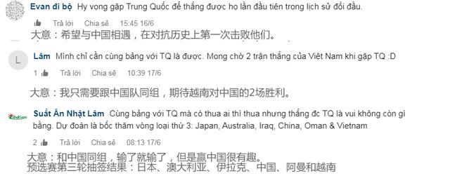 (上图)有球迷表示希望跟中国队相遇,然后在交锋史上第一次取胜。有网友留言,表示跟中国队同组输了也没啥,但赢了就很有意思。也有人表示只需要跟中国队同组,并期待越南队主客场都战胜中国队。