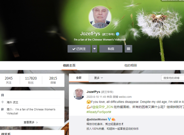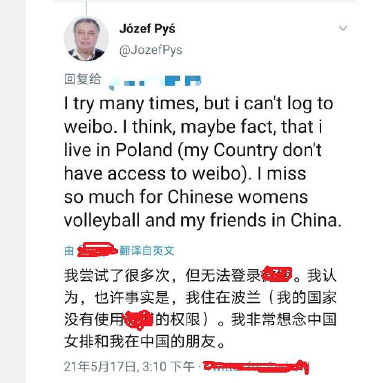 不过,在中国女排今天战胜波兰女排之后,我们再登录波兰爷爷的社媒,终于看到了他的消息:
