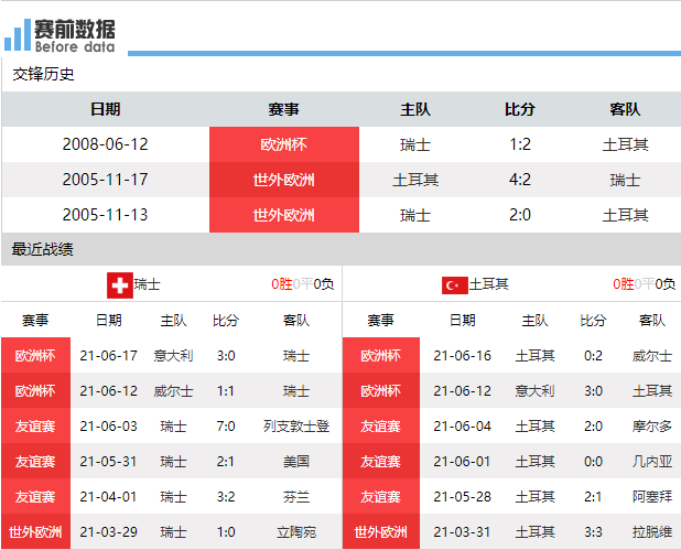 双方近3次交手,瑞士1胜2负,处于下风。瑞士各项赛事近6场比赛4胜1平1负,球队除了输给意大利外,整体战绩出色;土耳其各项赛事近6场比赛2胜2平2负,整体战绩不佳。