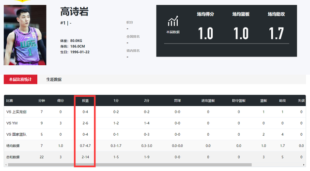 高诗岩打了三场比赛,14次出手,只命中了2球,拿到了2分。其中,1分球5投1中,两分球9投1中。除此之外,高诗岩拿到了3篮板5助攻,正负值为-10。