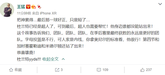 赛后,王猛谈到比赛时也直言,杜兰特是超人,但神也需要帮手:“杜兰特已经是超人了,可到最后,超人也需要帮忙!他身边谁都没能站出来。”的确,团队更强的雄鹿赢了,杜兰特成为孤胆英雄。杨毅同样在总结比赛时指出杜兰特真的累了,并且对篮网最后时刻的战术提出质疑,他指出纳什确实是一名新帅,而篮网本赛季无法拿到冠军,也并非意外。