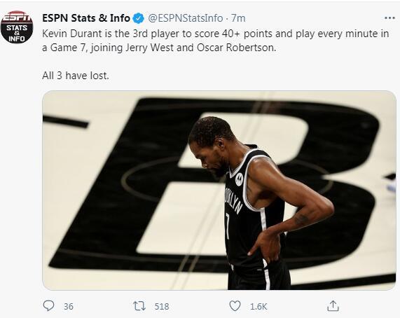 NBA历史上抢七大战一分钟没有休息拿下40分的球员只有三人,分别是杰里-韦斯特、奥斯卡-罗伯特森、凯文-杜兰特,但都输球了,也就是说抢七大战没有休息拿40+是一个不赢球魔咒啊!