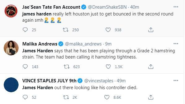哈登无疑是输球的罪人,他全场比赛52分51秒,17中5,三分12中2,罚球10中10拿下22分9篮板9助攻1抢断1盖帽,命中率29.4%,三分命中率16.7%,他在加时赛没有任何贡献。但他在赛后丢锅伤病了,哈登说道:“我遭遇的是腿筋二级拉伤。”腿筋二级拉伤至少需要2个月以上的恢复期,言下之意我是带伤出场已经尽力了。