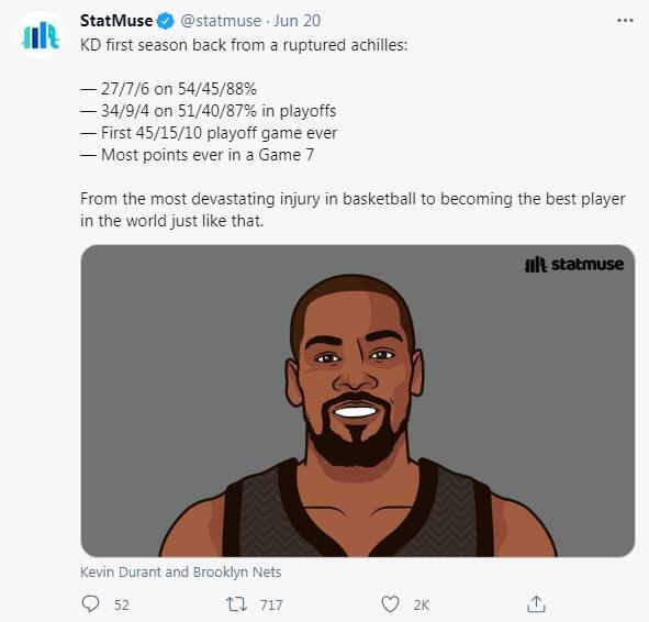 季后赛场均34分9篮板4助攻,命中率51%,三分命中率40%,罚球命中率87%,从患上毁灭运动员生涯的重大伤病到全世界最好的篮球员,就是这样。话外之音就是:杜兰特受伤了也是全球最强,扎心哈登了。