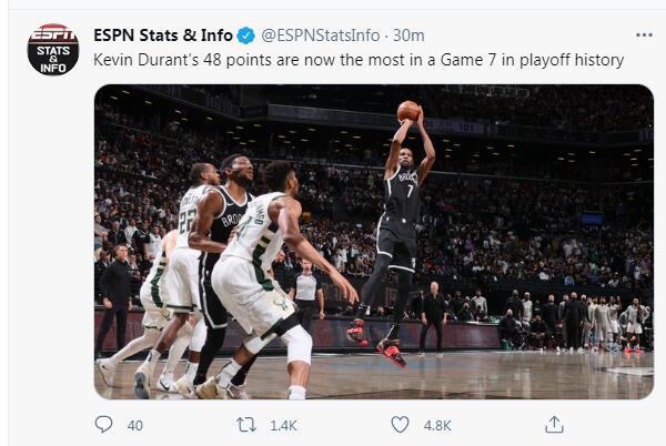 篮网111-115不敌雄鹿无缘东决,篮网在2-0领先雄鹿的情况下被逆转吞下耻辱纪录。扬尼斯-阿德托昆博以62.5%的命中率拿下40分13篮板5助攻十分闪耀,凯文-杜兰特虽然拿下48分9篮板6助攻但最终是输球了,所谓败军之将不足言勇,可美国媒体与美国球迷都不这样认为,他们觉得杜兰特已经足够伟大。